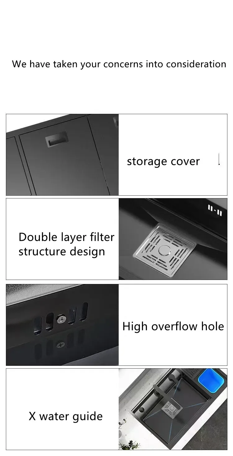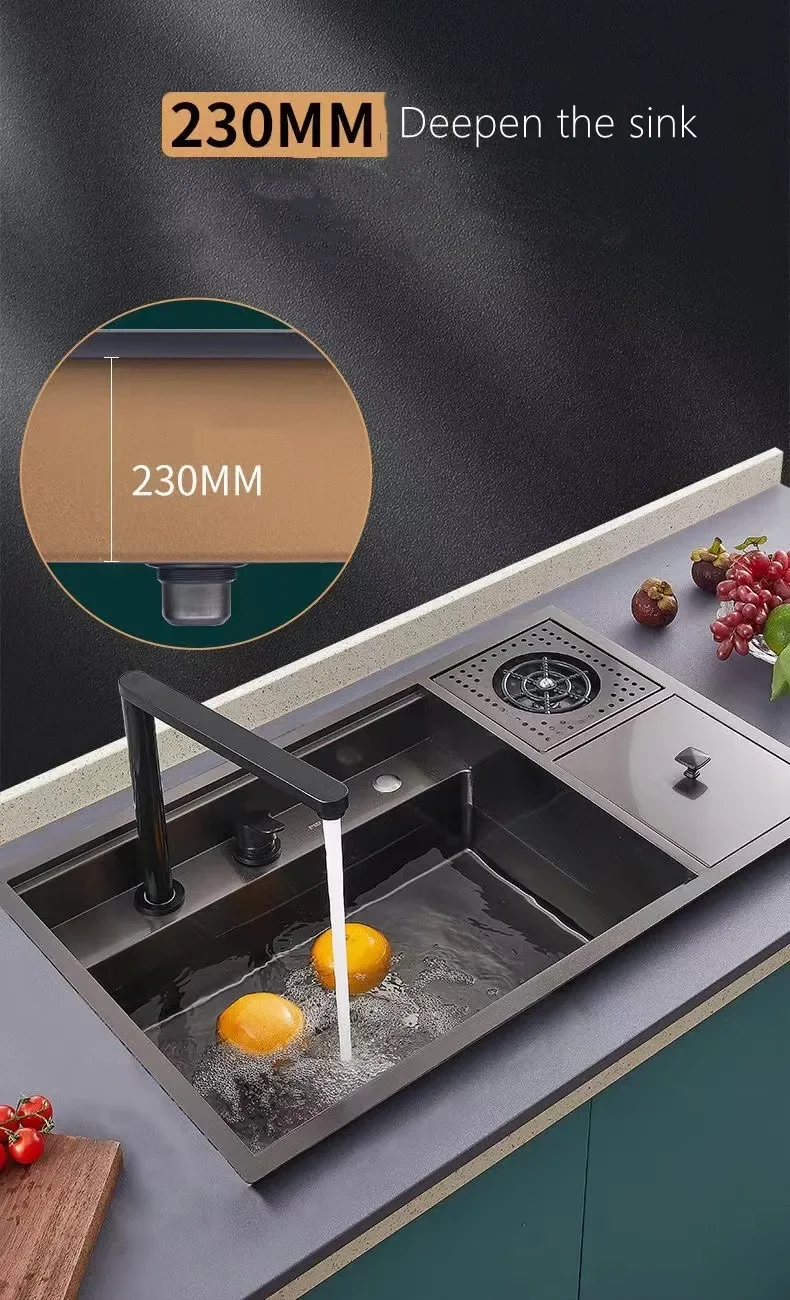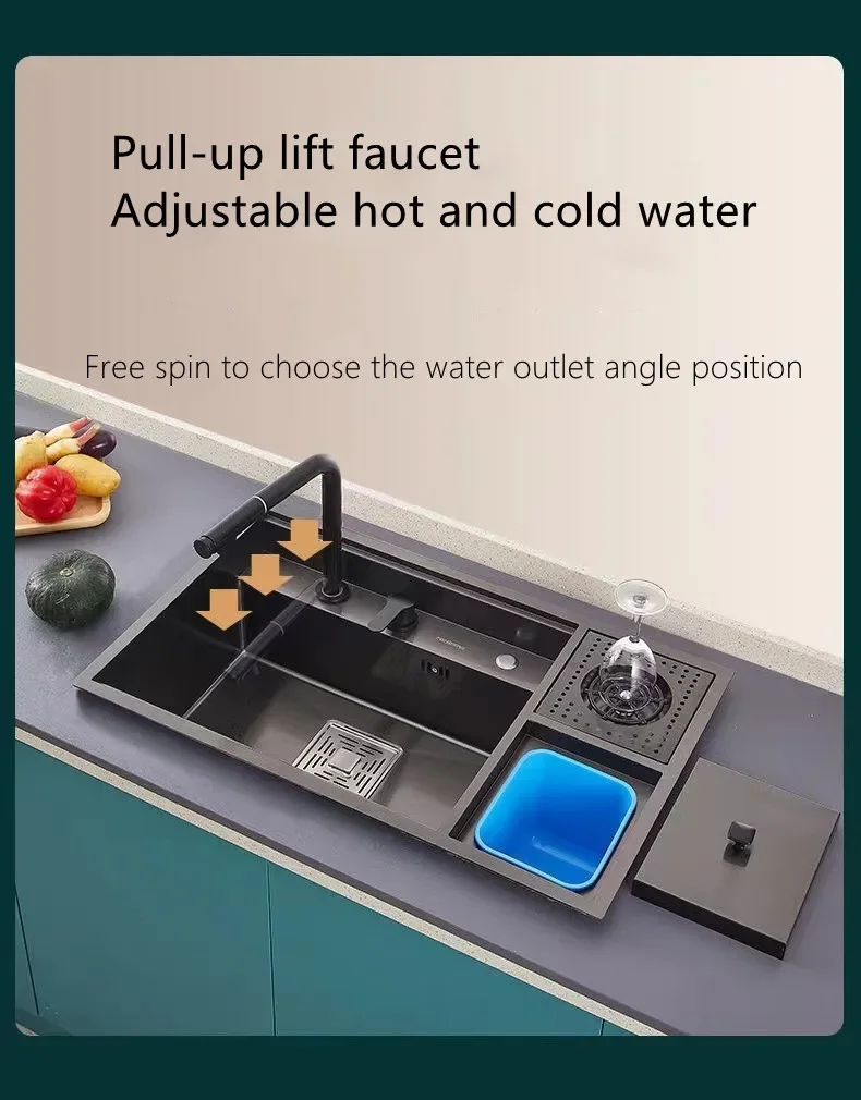 Waterfall Kitchen Sink with Multifunction Digital Display Faucet Stainless Steel Embossed Large Single Slot Kitchen Accessories