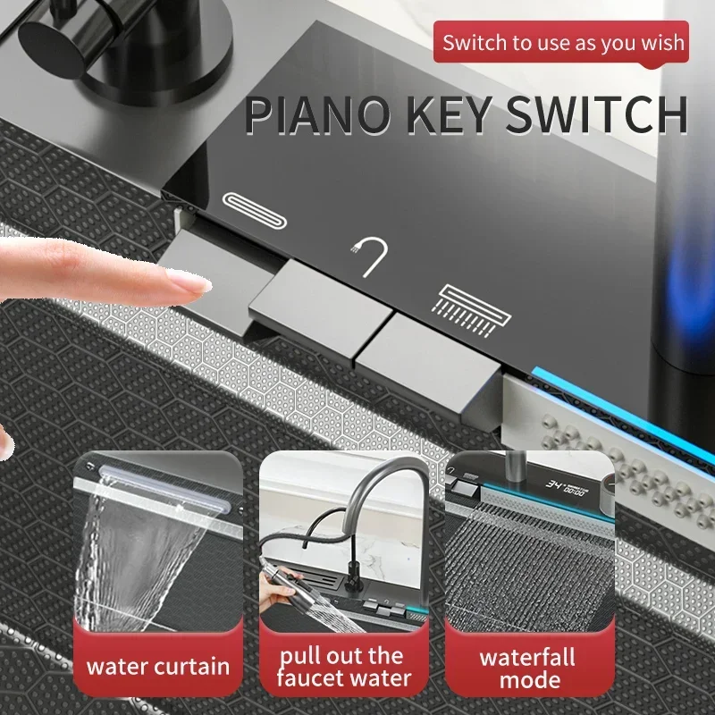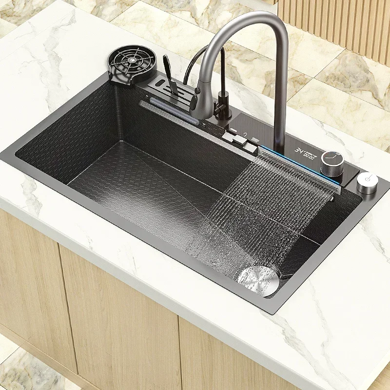 Digital Display Waterfall Sink Embossed Stainless Steel Kitchen Sink Large Single Bowl Black Washbasin with Kitchen faucet